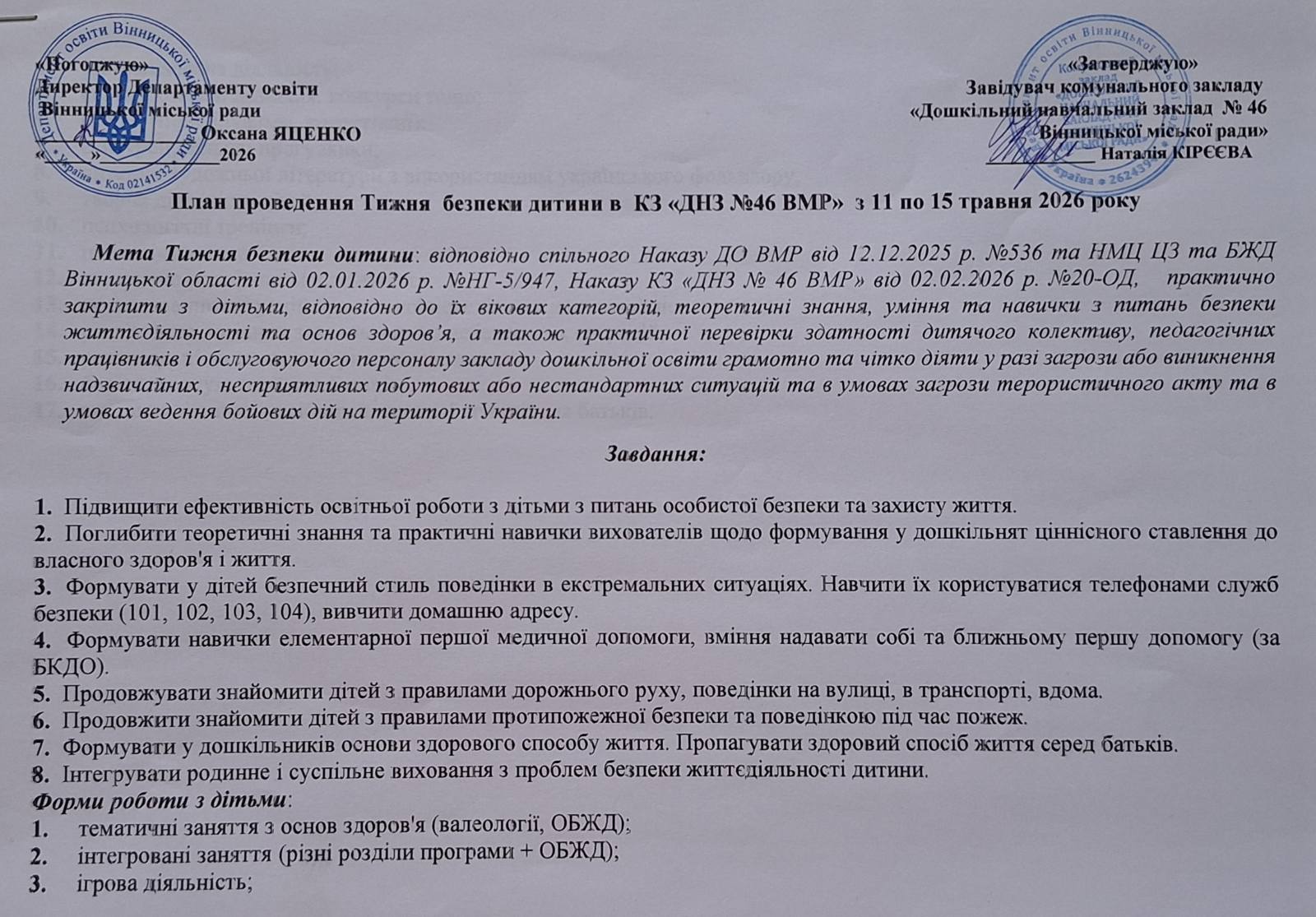Наказ про проведення “Тижня безпеки дитини” в КЗ “ДНЗ №46 ВМР” в 2025-2026 н.р.